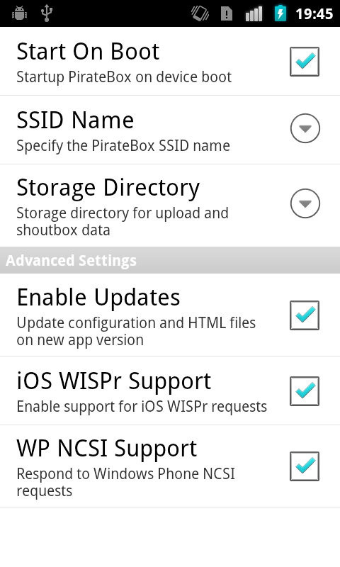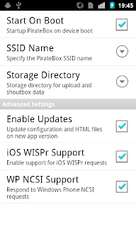 Start On Boot: If you check that option, the PirateBox will start up after the device has been booted and the SD card is ready.